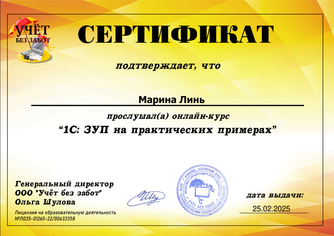 Более 10 лет я совмещала работу преподавателя 1С и должность главного бухгалтера. За это время сталкивалась с довольно сложными разделами учёта, принимала участие в налоговой оптимизации и внутренних аудиторских проверках. А как сертифицированный преподаватель 1С обучила на очных курсах более 500 слушателей. Также в моем активе внушительный опыт проведения практических семинаров, индивидуального и корпоративного обучения.
