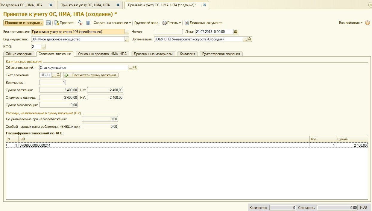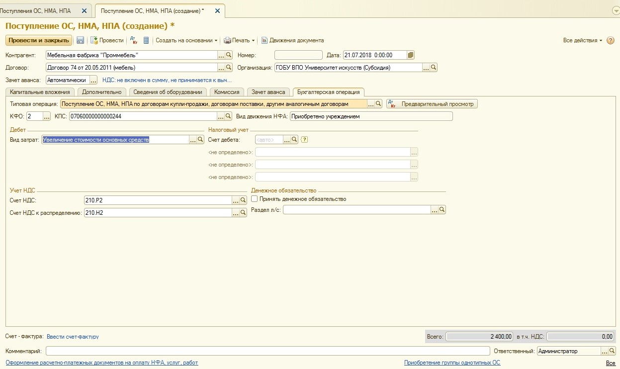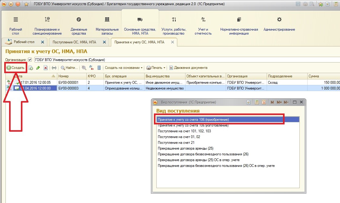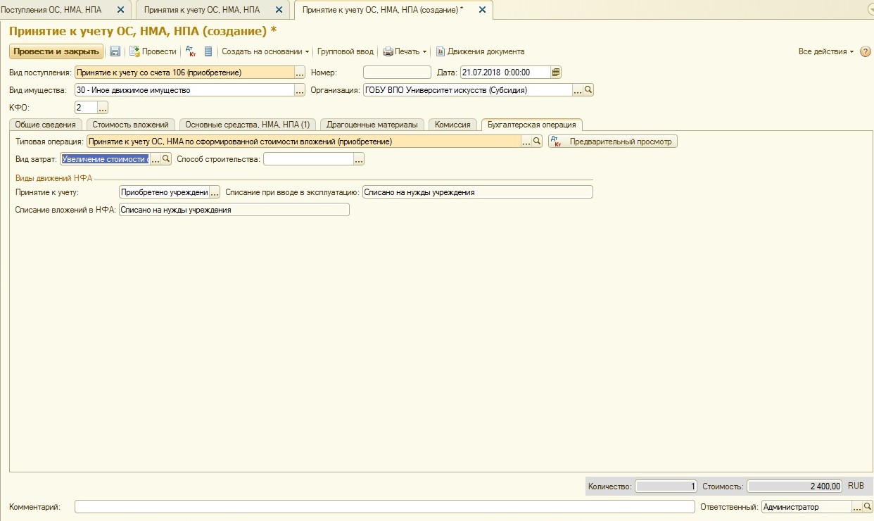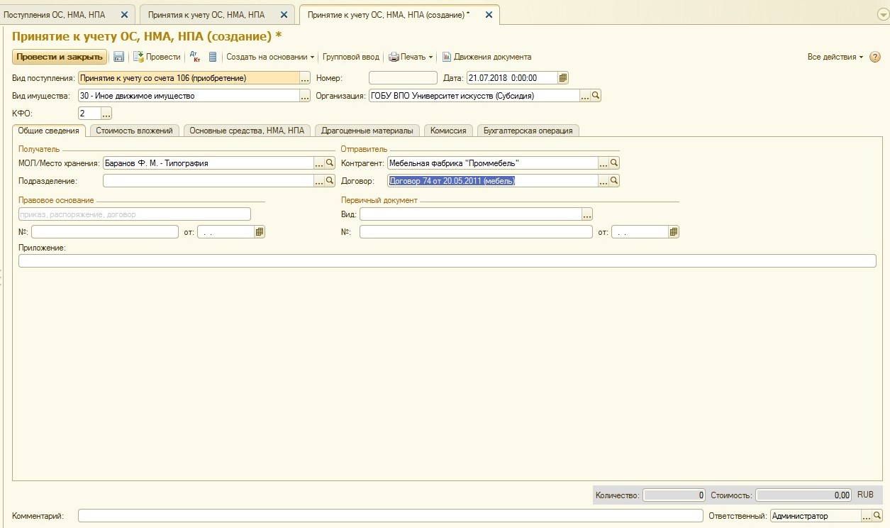 Покупается основное средство всегда на балансовые счета группы 106.00 «Вложения в нефинансовые активы». Так как основное средство в случае его покупки (а не передачи) сначала формирует первоначальную стоимость на счетах группы 106.00 – у документа «Поступление ОС, НМА, НПА» нет операций с использованием забалансовых счетов: