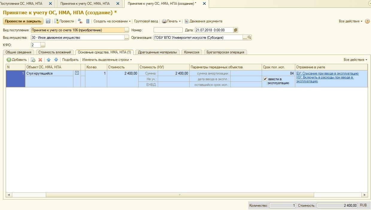Этим же документом вводим вновь приобретенное ОС в эксплуатацию и указываем требуемые параметры: