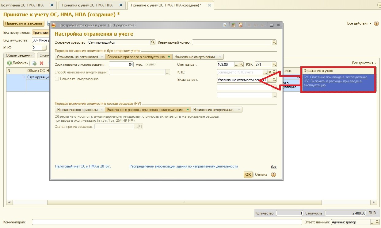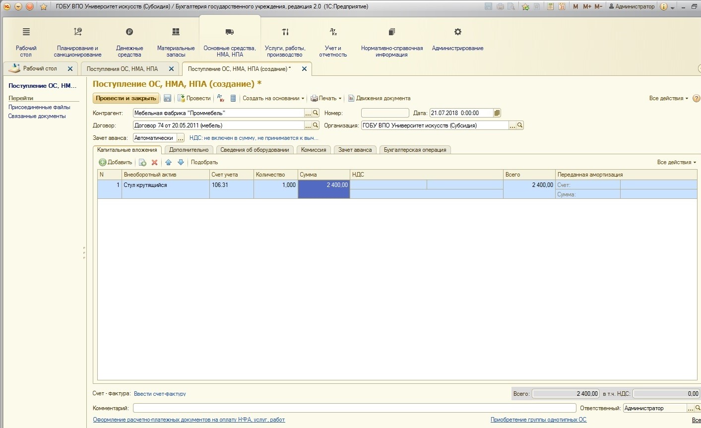 Рассмотрим пример: учреждение покупает стул, стоимость которого 2400 рублей.