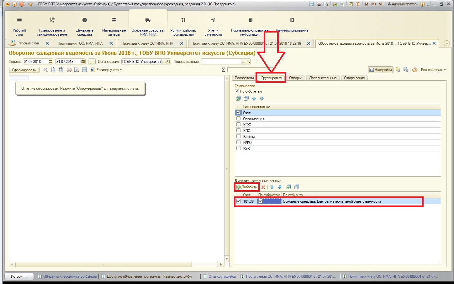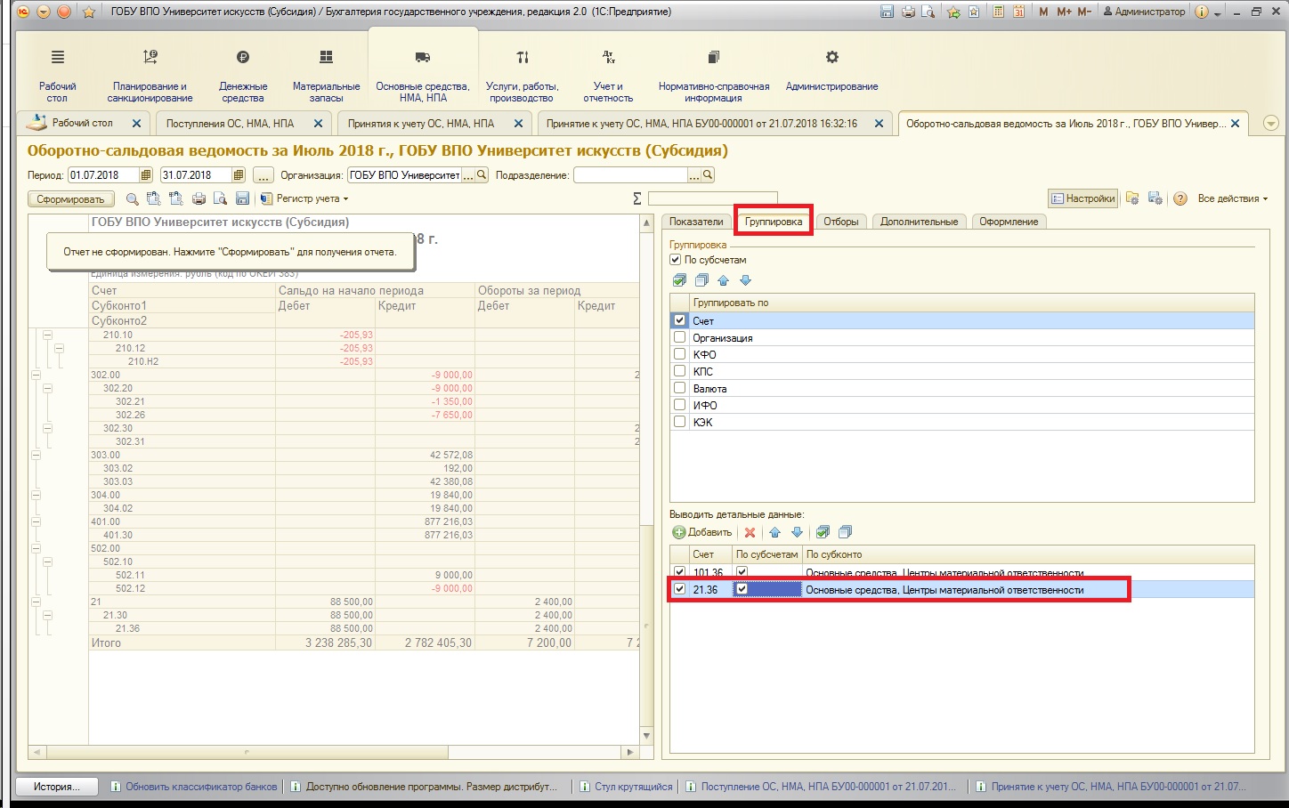 Для оценки этой ситуации проанализируем оборотно-сальдовую ведомость, добавим в настройках удобную детализацию: