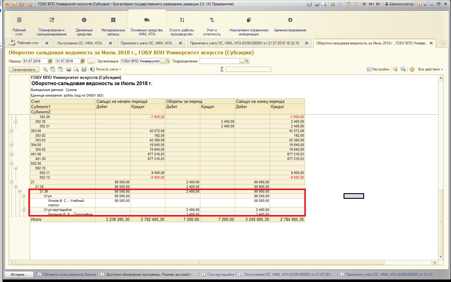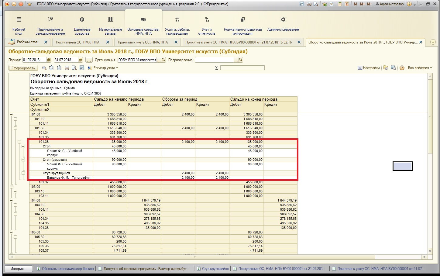 Как видно из отчета, по нужной нам аналитике (новое основное средство – крутящийся стул), счет 101.36 закрывается, остатков в результате операции нет. Сальдо сохраняется только на забалансовом счете.