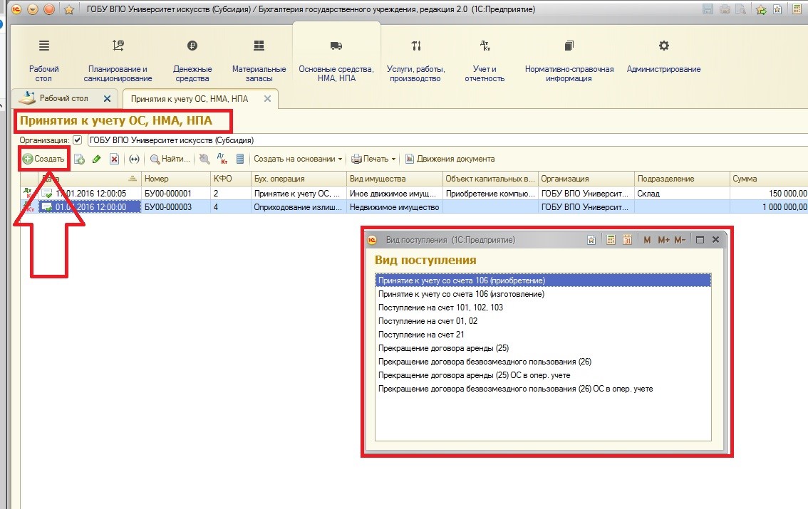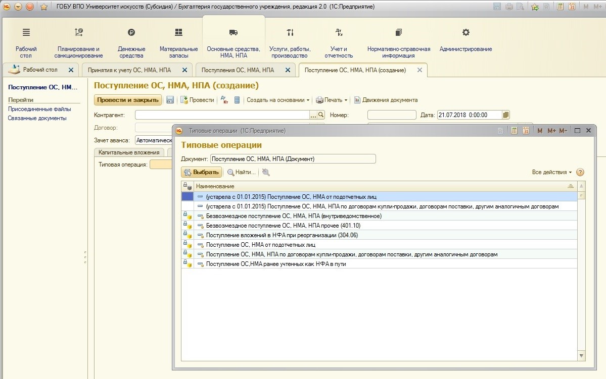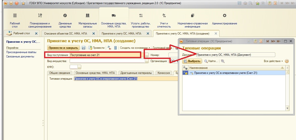 При создании документа «Принятие к учету ОС, НМА, НПА» сразу необходимо выбрать вид поступления: на баланс или забаланс. На мой взгляд, это удобно: не нужно запоминать, какие документы используются для балансовых счетов, а какие – для забалансовых. Бухгалтер использует одни и те же документы, при этом указывает только меняющийся вид и бухгалтерскую операцию. Если вы ошиблись при первоначальном выборе, документ можно изменить, перевыбрав вид поступления и перезаполнив поля.