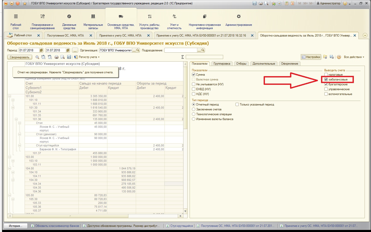 Чтобы в оборотно-сальдовой ведомости также видеть и забалансовые счета, установим необходимую настройку: