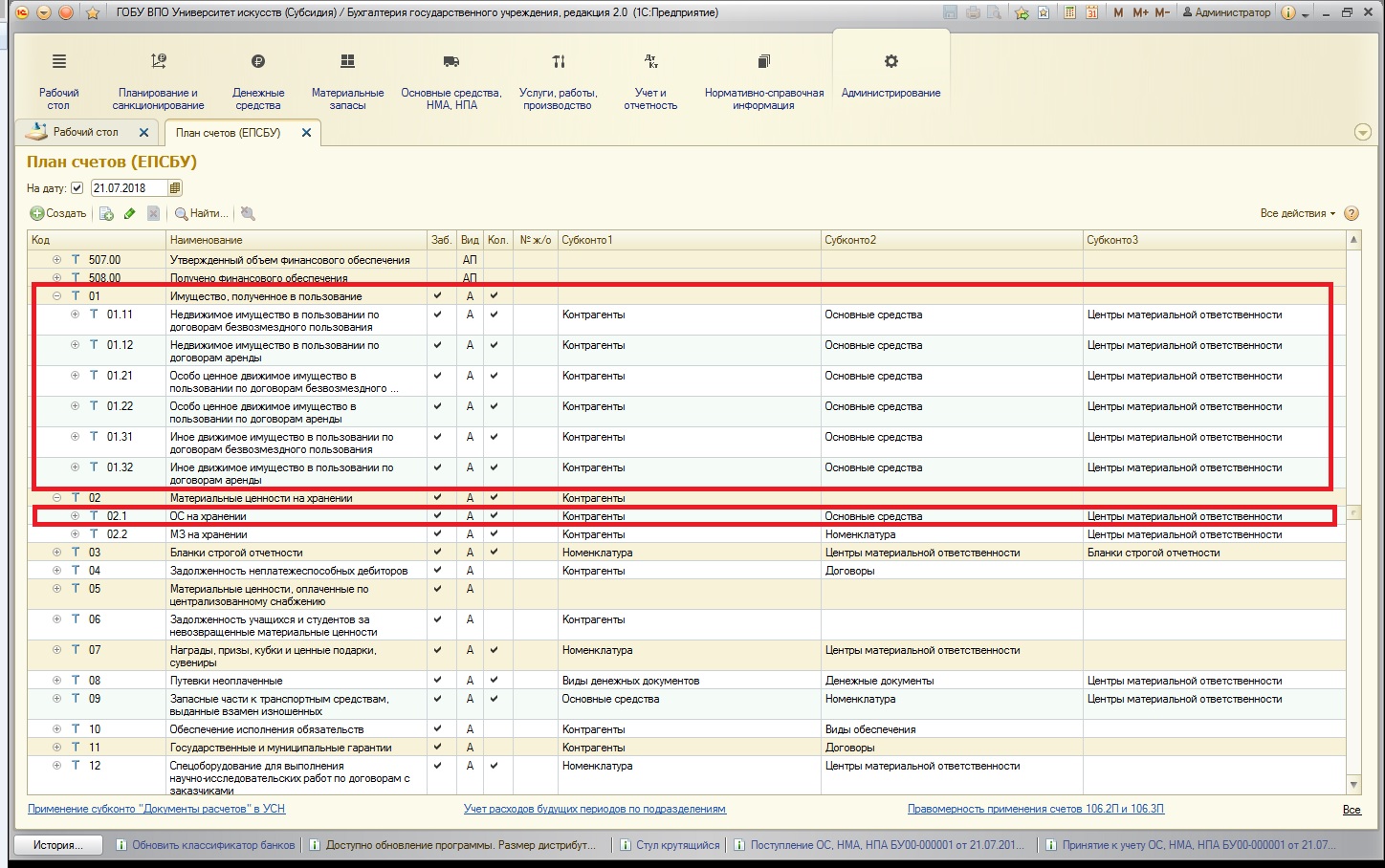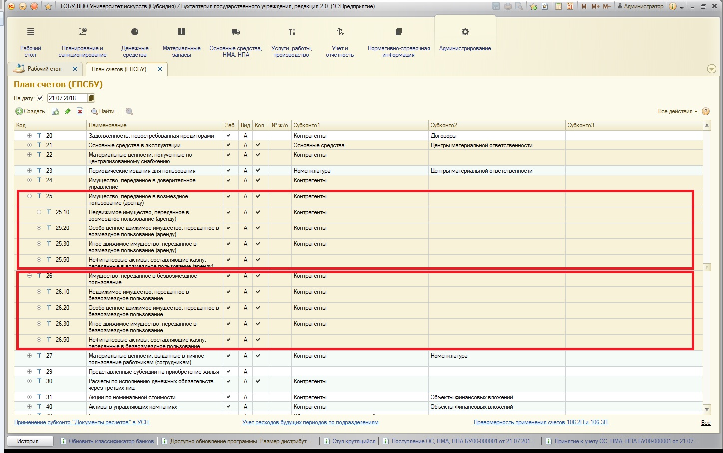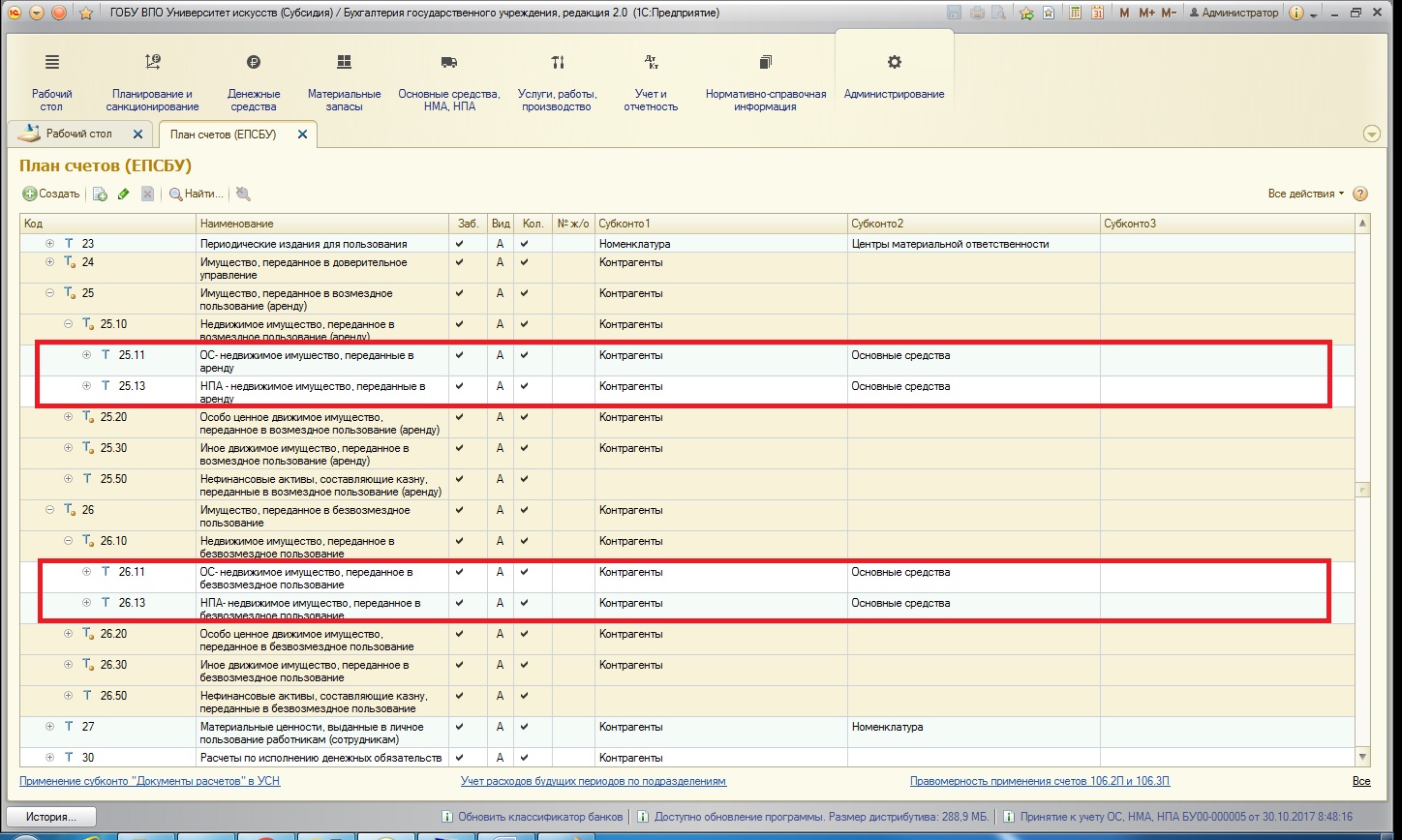 4. основные средства, которые переданы в пользование – на забалансовых счетах групп 25 и 26, будь то возмездная (аренда) или безвозмездная передача в пользование – отражаются только объекты учета операционной аренды. Как мы помним, в соответствие с новым СГС «Аренда», на балансовых счетах необходимо отражать объекты финансовой аренды. А предварительно – в обязательном порядке классифицировать все имеющиеся объекты (подробнее в статье Федеральный стандарт «Аренда» - учет с 2018 года в 1С: БГУ 8).