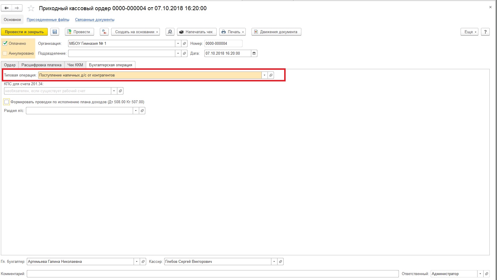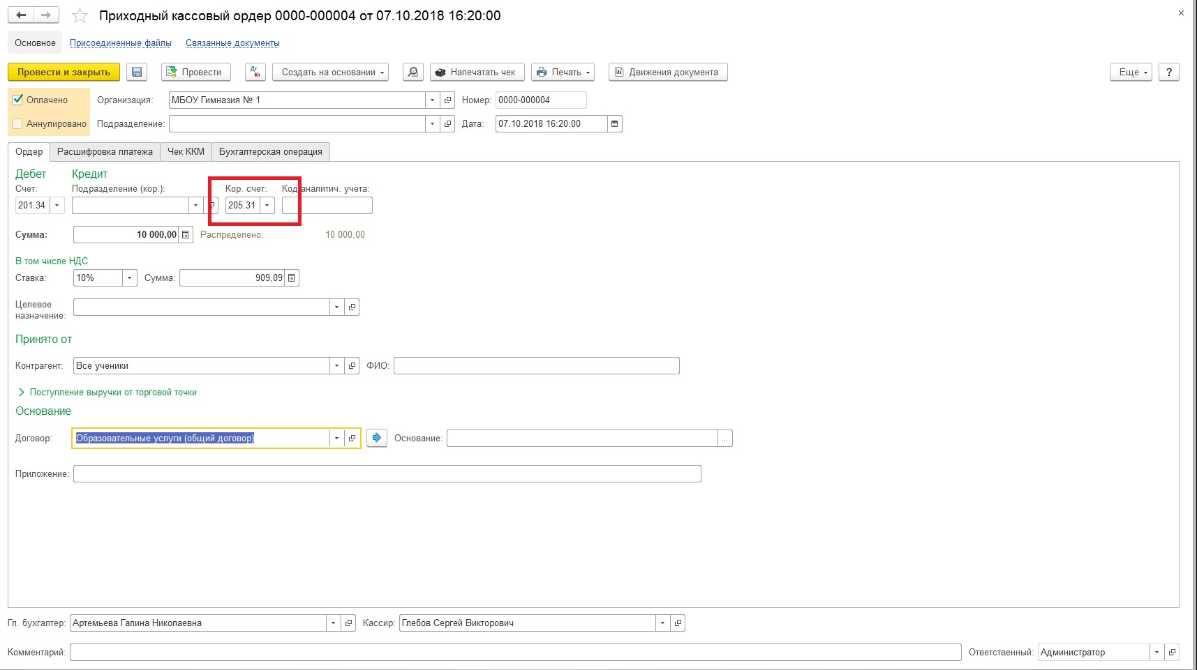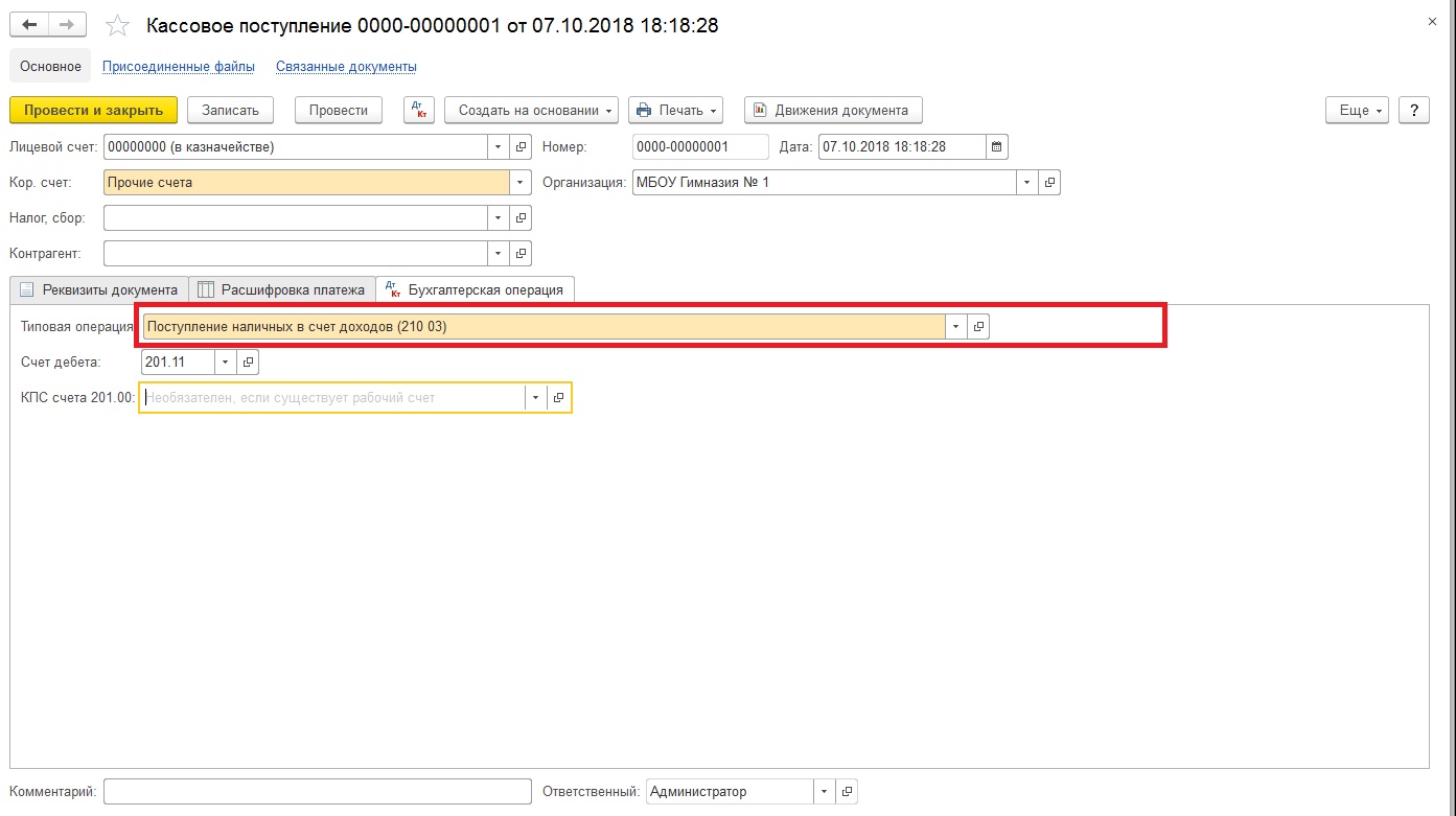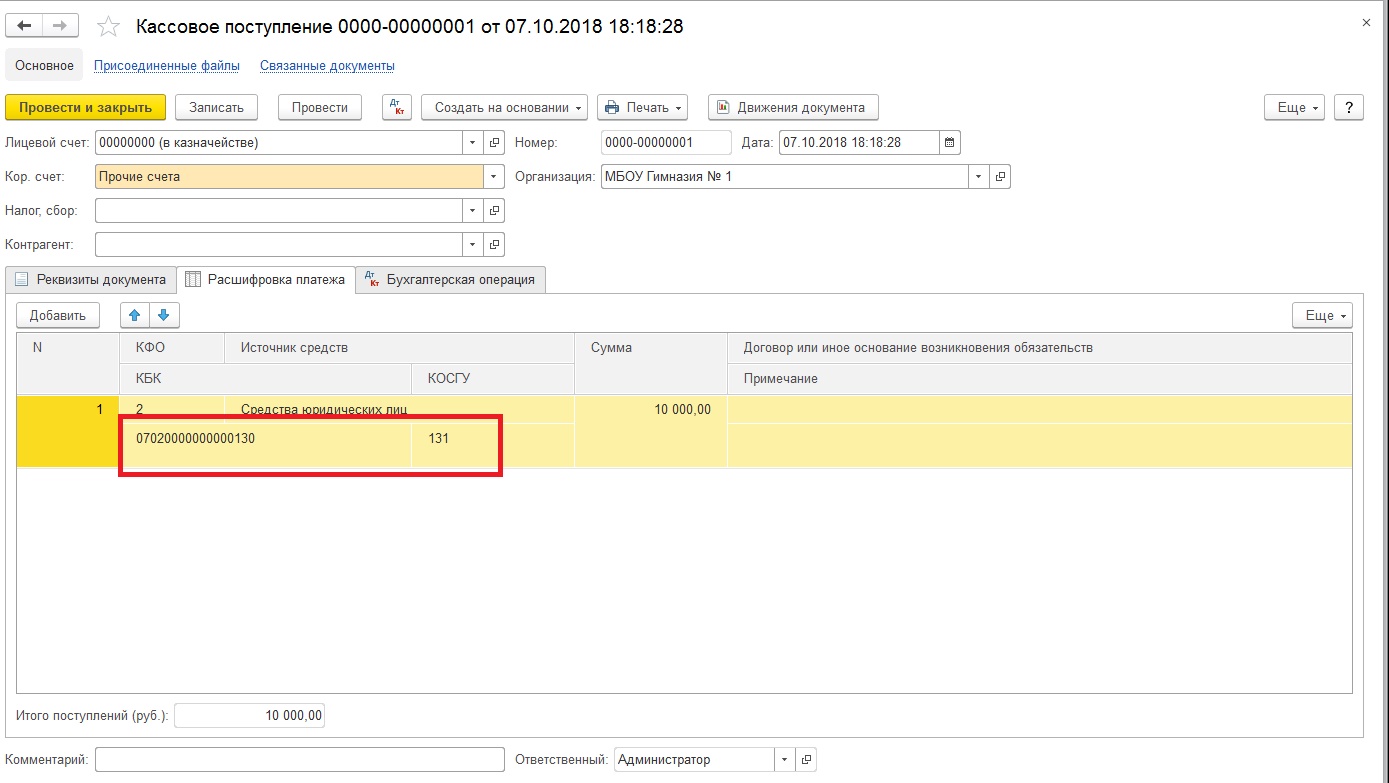 Рассмотрим небольшой практический пример: бюджетное учреждение МБОУ «Гимназия № 1» оказывает платные образовательные услуги, за которые родители учащихся могут рассчитаться наличными. В конце дня денежные средства, поступившие в кассу, передаются ответственному лицу дирекции, которое вносит их на карту, а в последующем – деньги поступают на лицевой счет, открытый в органе Федерального казначейства.