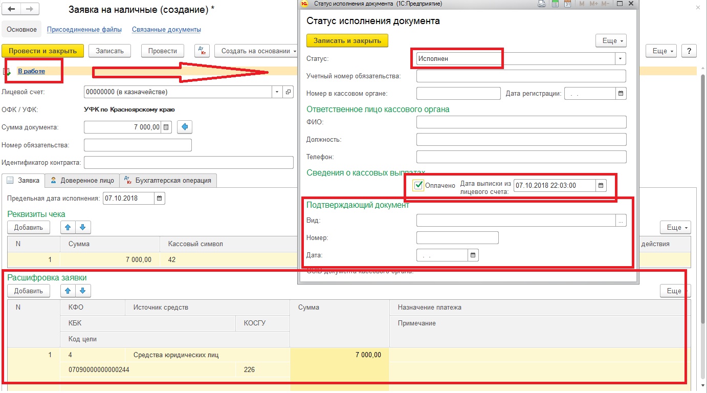 Первичными документами являются заявка на наличные, платежное поручение, составленное органом Федерального казначейства и выписка из лицевого счета.