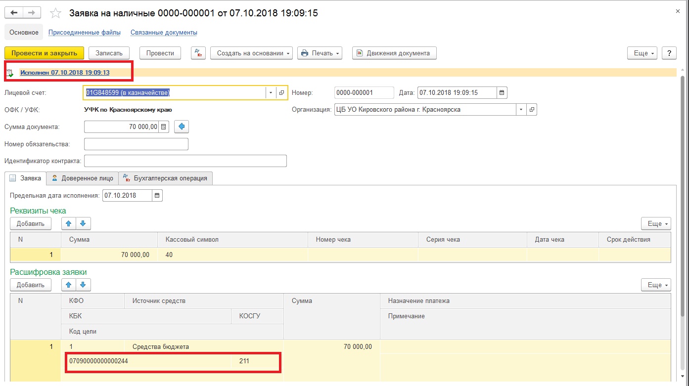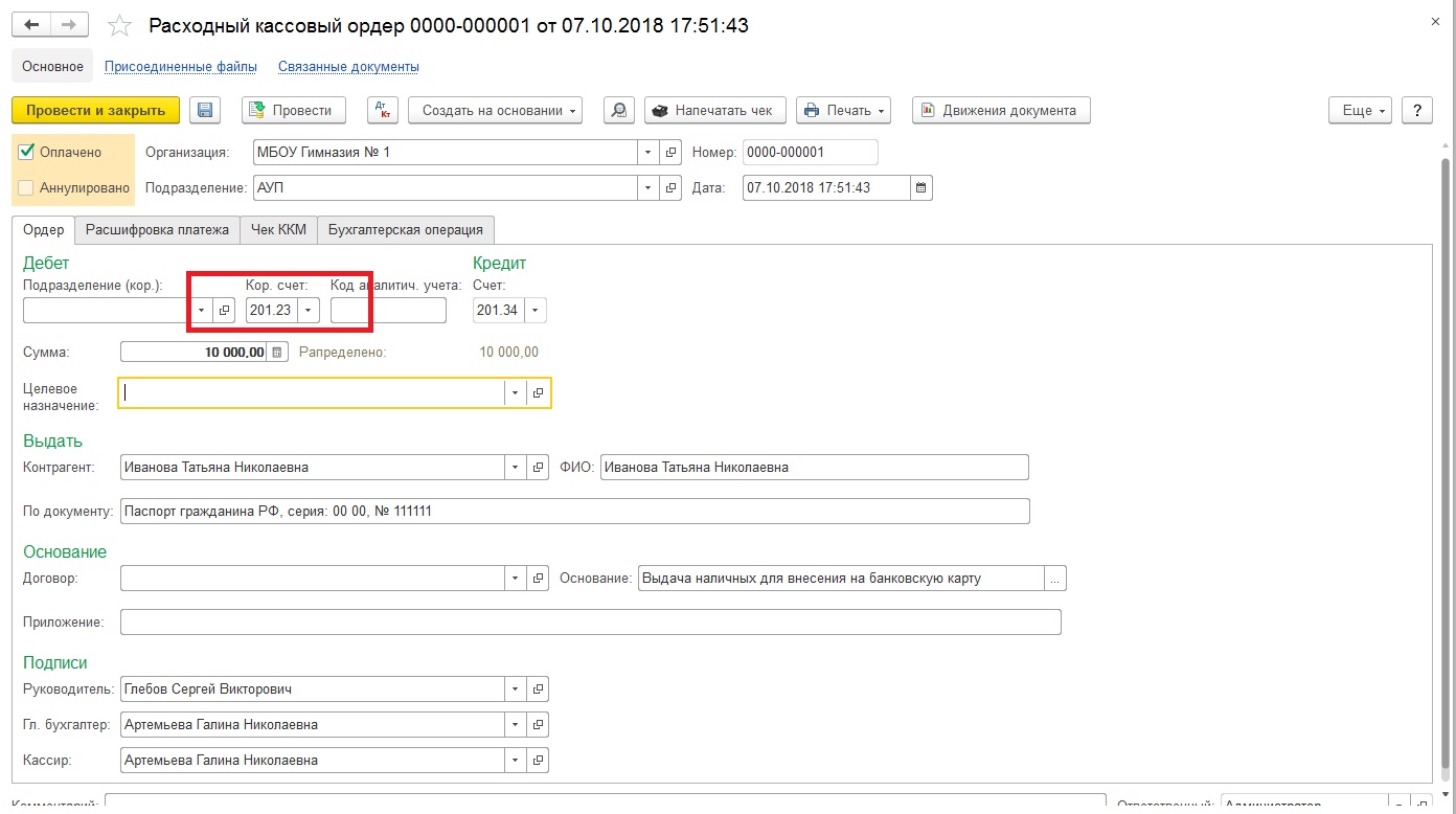 Далее рассмотрим следующий пример: бюджетное учреждение МБОУ «Гимназия № 1» получило в кассу учреждения для выдачи подотчетному лицу денежные средства.