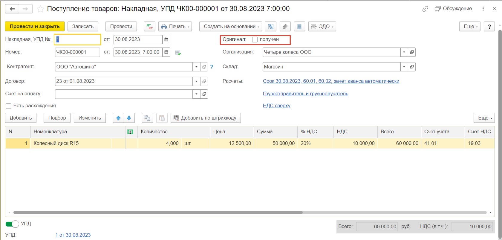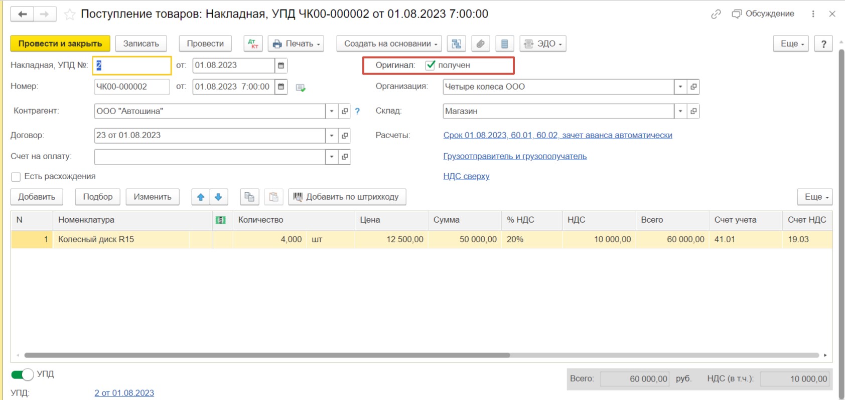 Допустим, мы закупили товар у нашего поставщика по двум накладным. Документы по первой накладной мы к учету приняли и зафиксировали, что у нас есть оригинал, отметив галочкой.