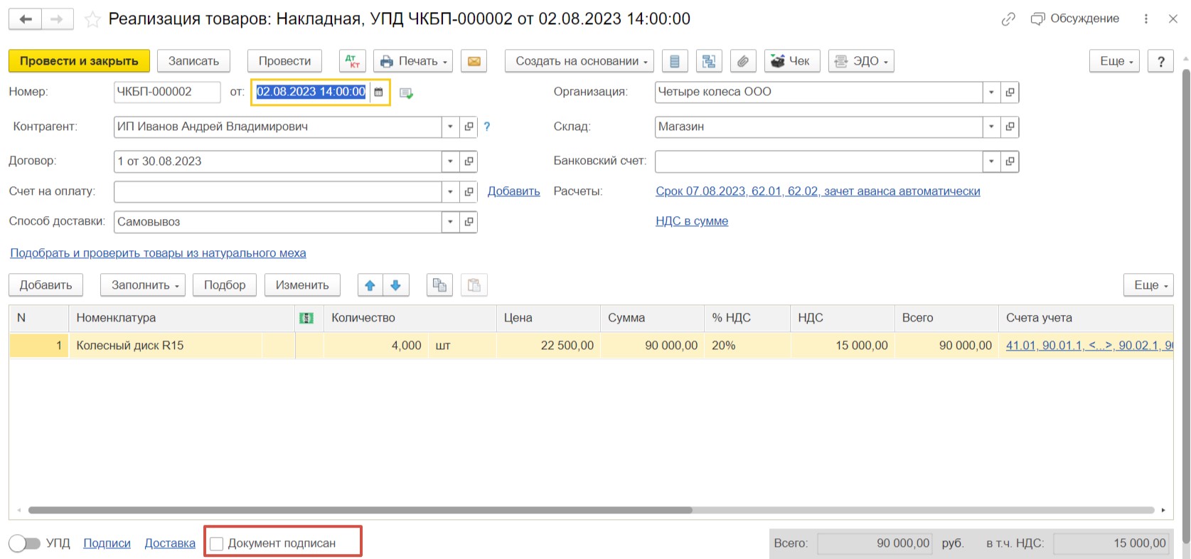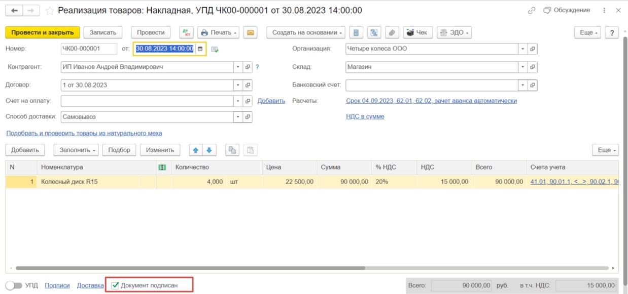 Далее рассмотрим пример, в котором мы продаем товар нашему покупателю по двум накладным. В одной из них мы отметим, что «Документ подписан» нашим покупателем.