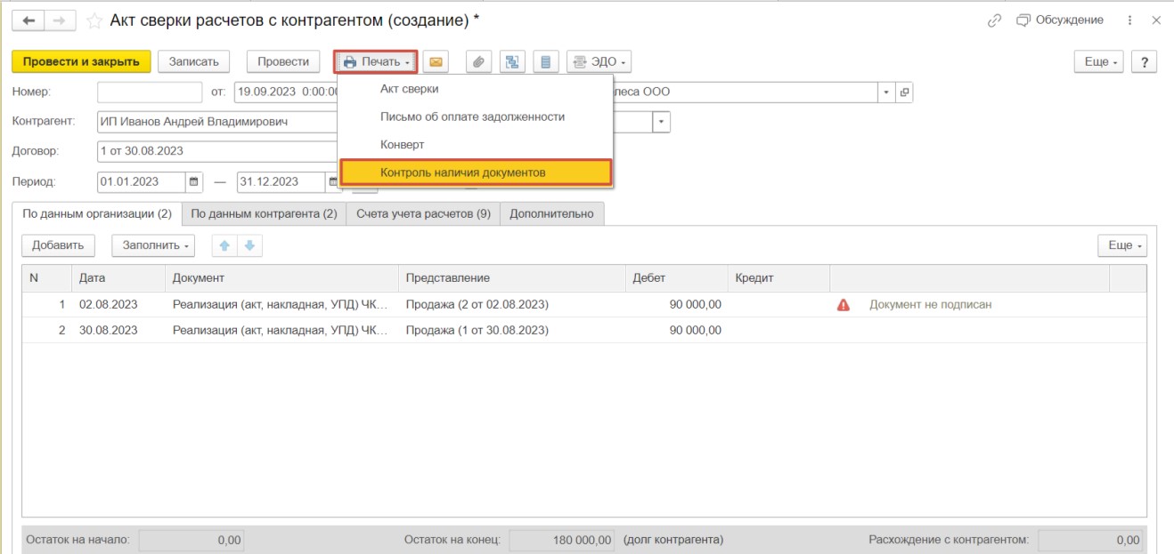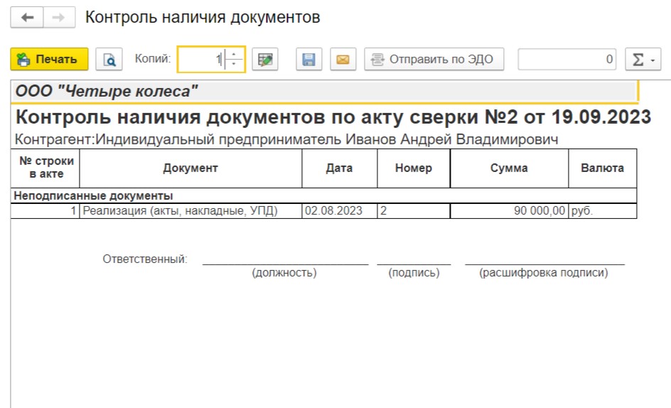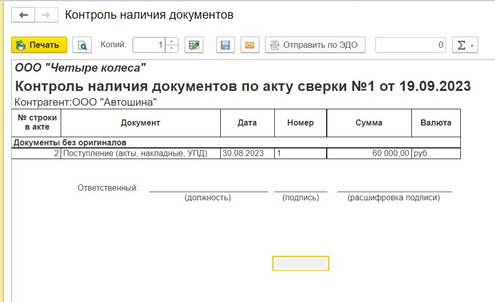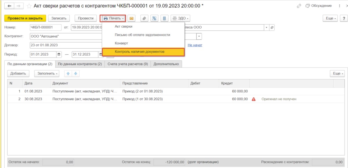Для этого нажмем «Печать» и выберем «Контроль наличия документов».