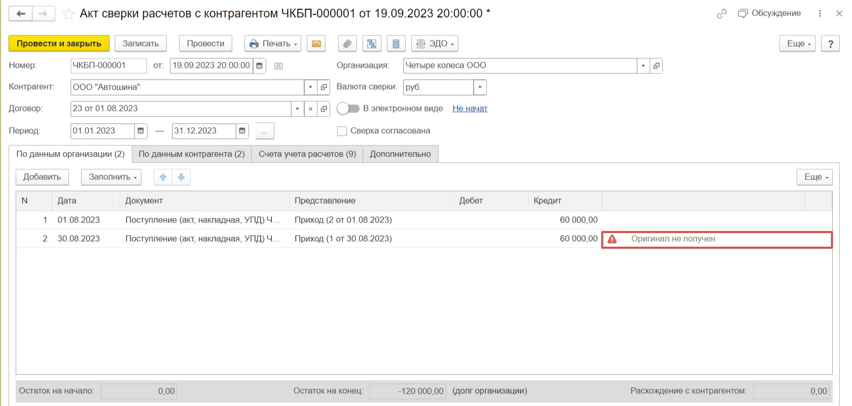 Мы видим, что напротив того документа, в котором мы не устанавливали галочку «Оригинал», во вкладке «По данным организации» появилась предупреждающая запись. Программа нам сообщает о том, что нет оригинала.