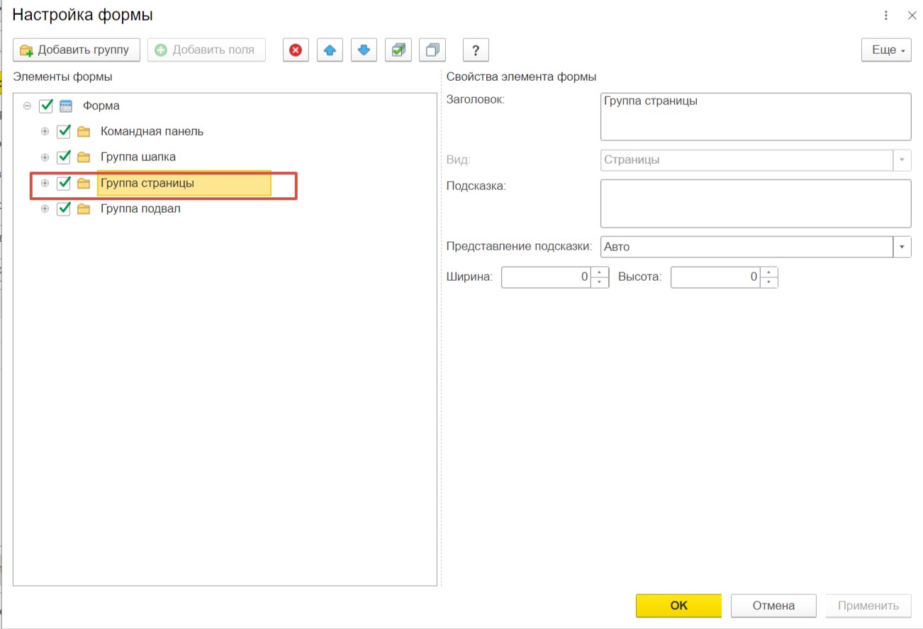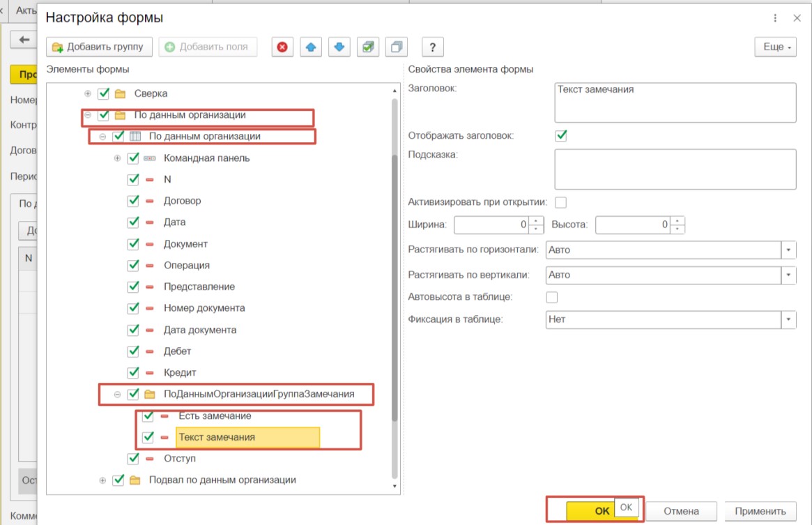 Далее раскройте поэтапно пункты «Группа страницы», «По данным организации», «По данным организации Группа Замечания» и установите галочки напротив «Есть замечания», «Текст замечания». Сохраним настройки, нажав «ОК».