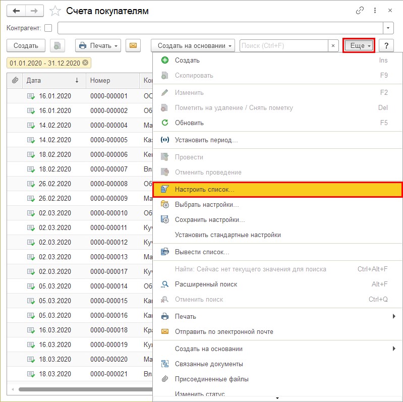 Шаг 1. Откройте журнал счетов в разделе «Продажи». Нажмите кнопку «Еще» и выберите команду «Настроить список…».
