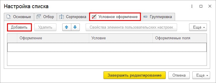 Шаг 2. Перейдите на закладку «Условное оформление». С помощью кнопки «Добавить» задайте условие.