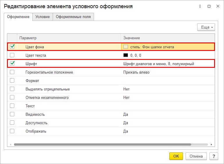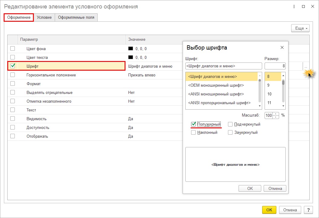 Шаг 3. На закладке «Оформление» задайте параметры. В нашем примере мы изменяем шрифт. Установите галочку, выбрав параметр «Шрифт» и нажав на кнопку с тремя точками, задайте – «Полужирный». Здесь же можно изменить начертание и размер шрифта.