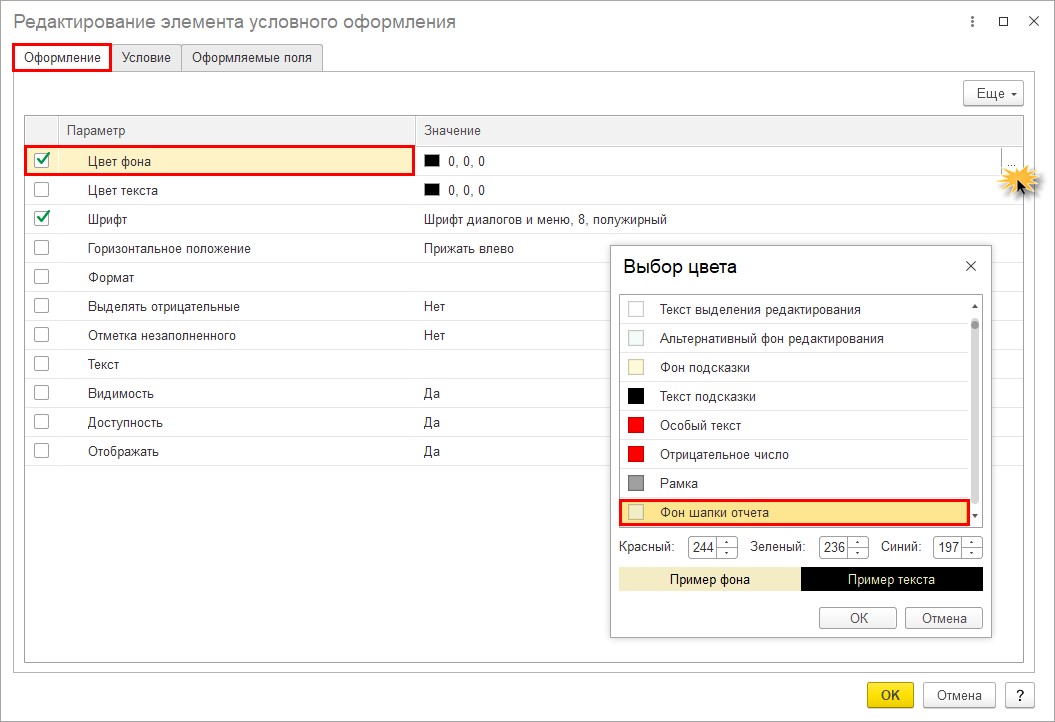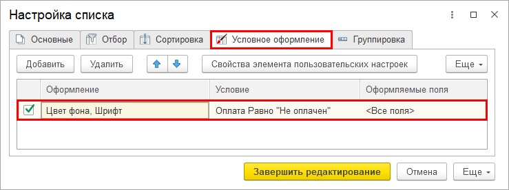 Здесь пользователь может задать динамическое оформление списка в зависимости от выводимых данных. Например, неоплаченные счета выделить жирным шрифтом.