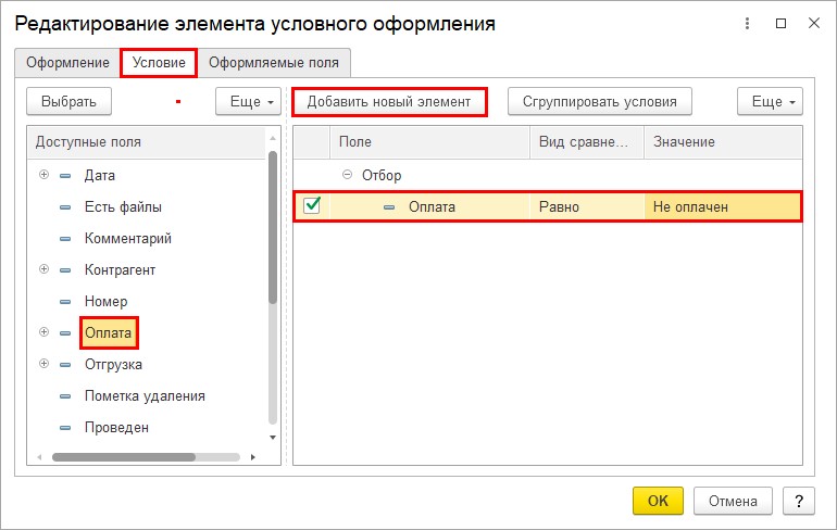 Шаг 5. Перейдите на закладку «Условие». Укажите поле отбора – «Оплата». Нажмите кнопку «Добавить новый элемент» для установления условия отбора и задайте условие – «Оплата» равно «Не оплачен».