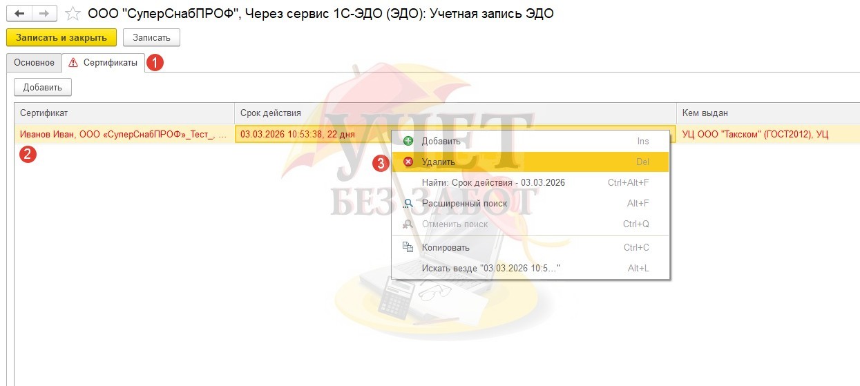 Перейдите на вкладку «Сертификаты», затем правой кнопкой мыши кликните по недействующему сертификату и в контекстном меню выберите «Удалить».