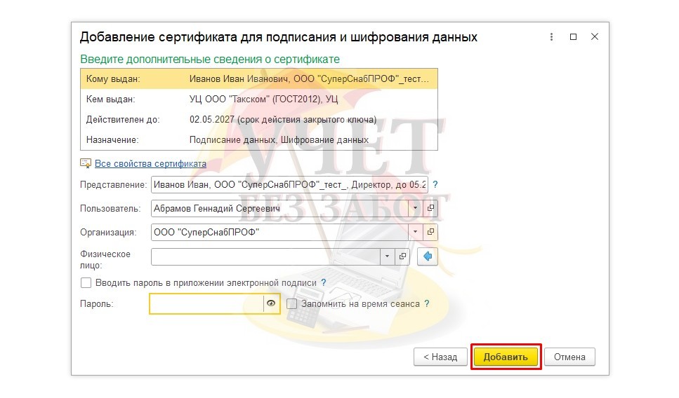 В следующем окне проверьте корректность данных сертификата, настройте список пользователей, которым будет разрешена работа с этой подписью (если будут пользоваться все пользователи базы, то можно оставить это поле пустым), при необходимости введите пароль от сертификата (если пароля нет, то поставьте галку «Вводить пароль в приложении электронной подписи». После заполнения нажмите «Добавить».