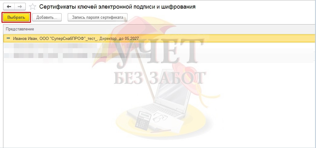 В списке сертификатов отметьте добавленный и нажмите кнопку «Выбрать».