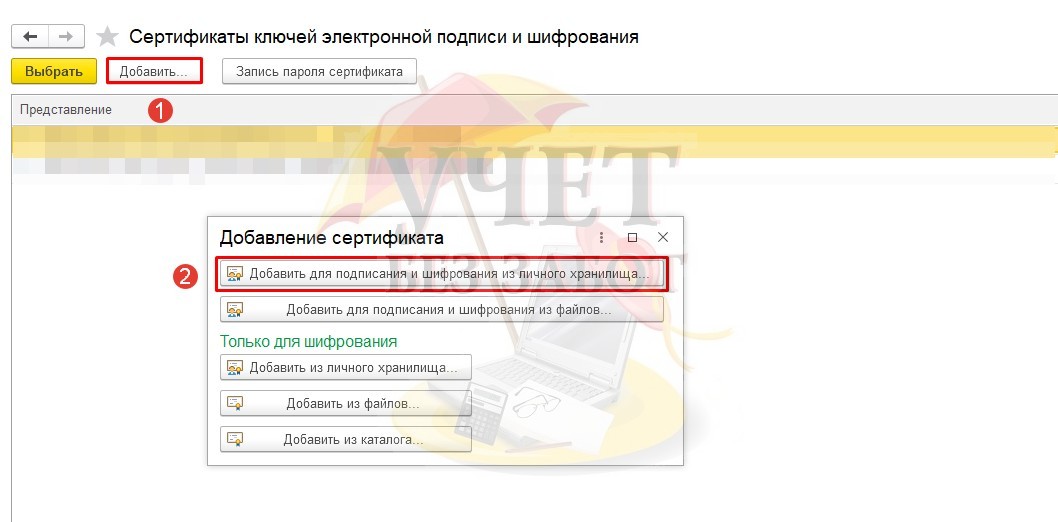 В открывшемся окне выберите «Добавить» - «Добавить для подписания и шифрования из личного хранилища».