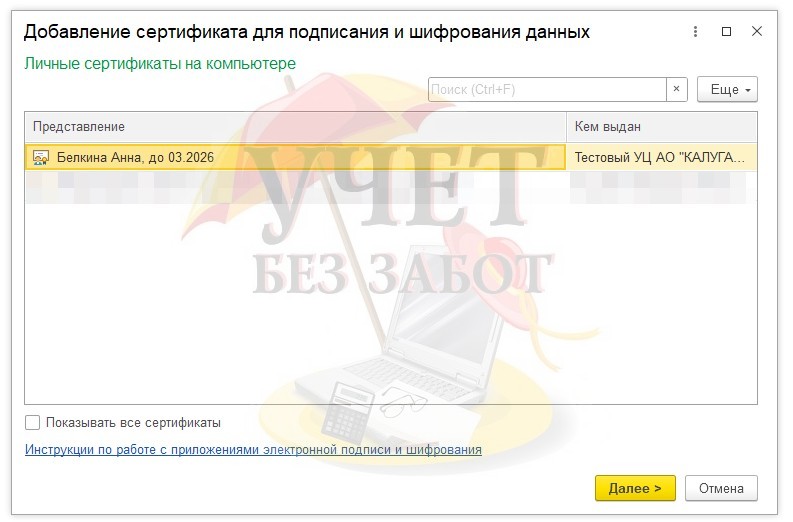 В списке доступных сертификатов найдите подпись сотрудника и нажмите кнопку «Далее».