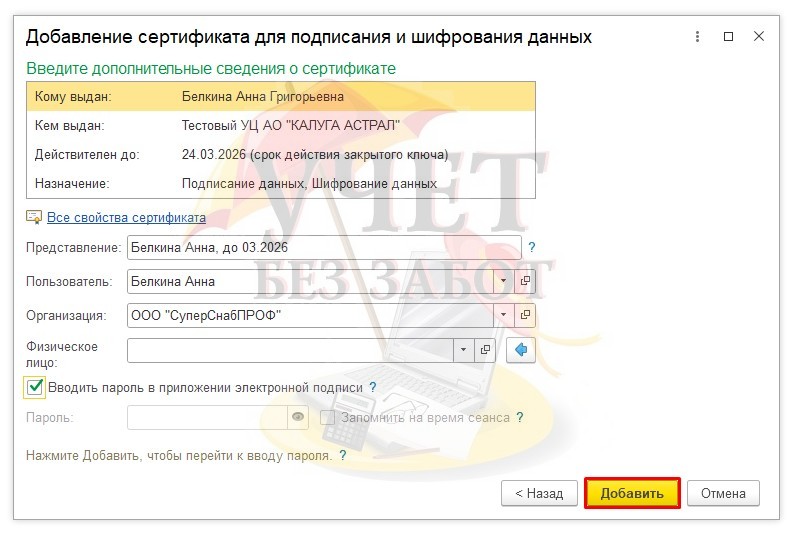 В следующем окне проверьте корректность данных сертификата, выберите пользователя, который будет пользоваться этой подписью, при необходимости введите пароль от сертификата (если пароля нет, то поставьте галку «Вводить пароль в приложении электронной подписи»). После заполнения нажмите «Добавить».