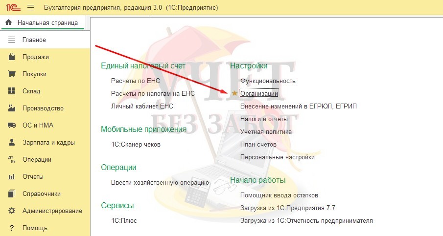 Для настройки уведомлений на электронную почту в разделе меню «Главное» выберите пункт «Организации».