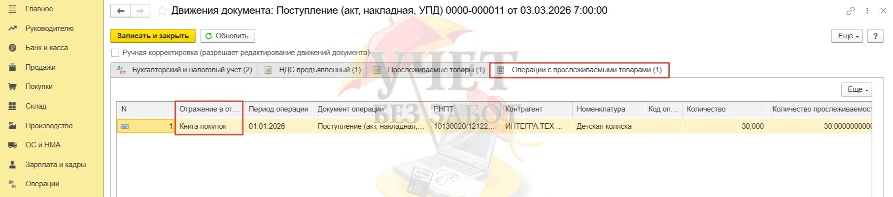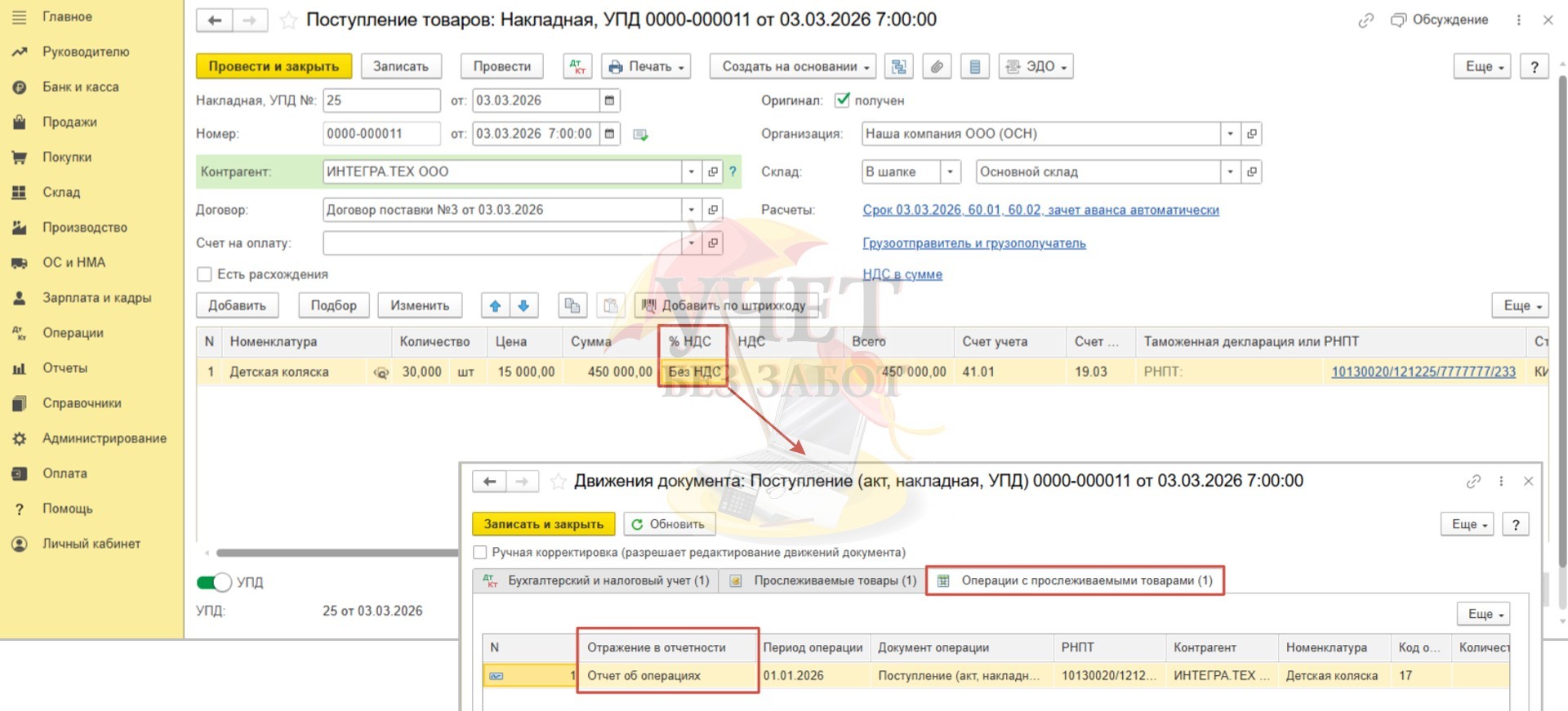 Обратите внимание, если в вашем случае поставщик не является плательщиком НДС (или освобожден от уплаты налога), то покупка прослеживаемого товара не попадет в Декларацию по НДС. При проведении документа поступления в этом случае в графе «Отражение в отчетности» на вкладке «Операции с прослеживаемыми товарами» будет указано значение «Отчет об операциях».