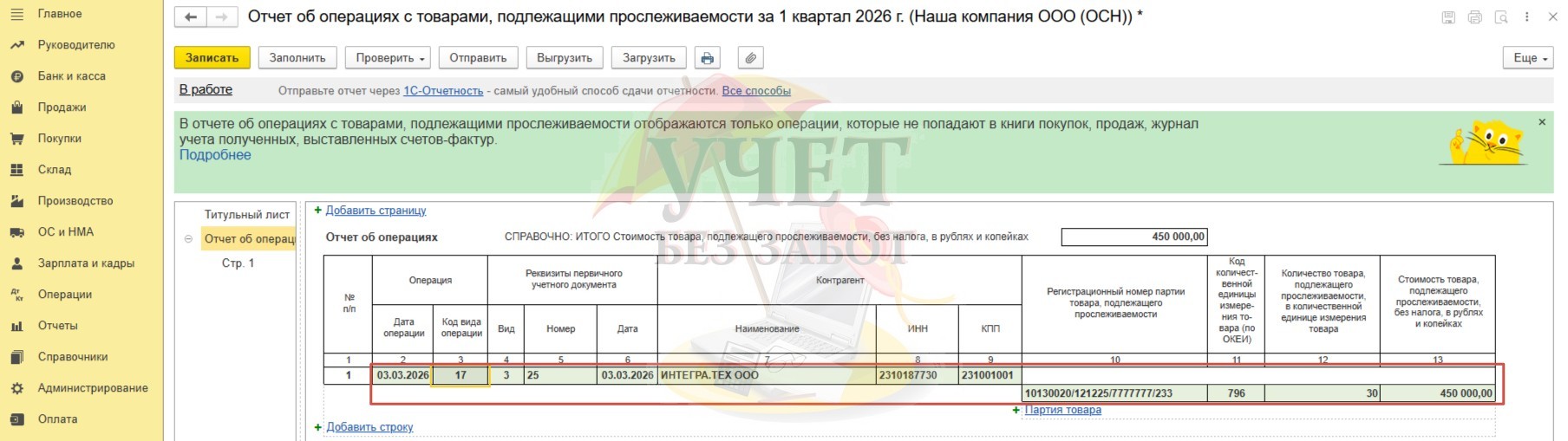 Данные о прослеживаемом товаре отражены с кодом вида операции «17».