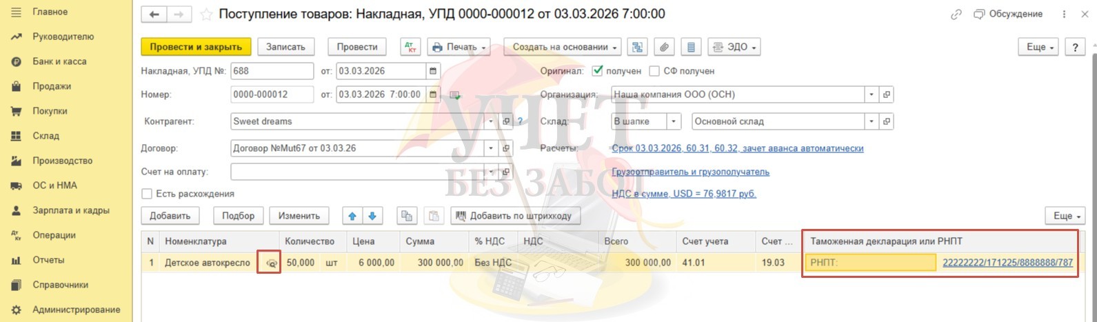При переносе в документ «Поступление товаров» такой номенклатурной позиции, появляется специальный значок