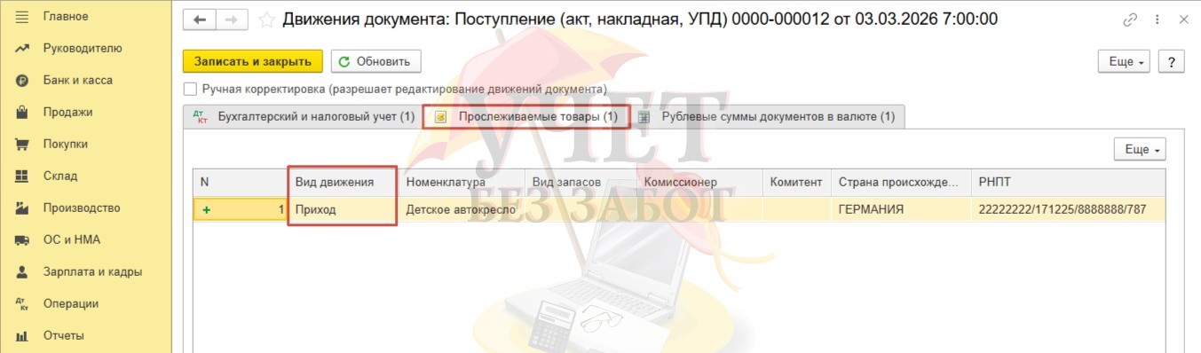 Проведем документ поступления товаров и посмотрим сформированные регистры. Регистр «Прослеживаемые товары» будет иметь вид движения «Приход» и содержать в себе сведения о приобретенном товаре.