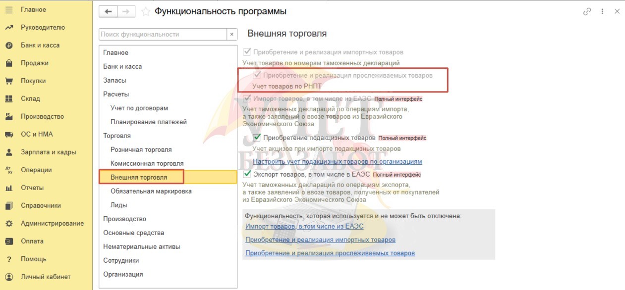 Для начала в разделе меню «Главное» - Функциональность» на вкладке «Внешняя торговля» необходимо поставить одноименную галочку, чтобы функционал прослеживаемости заработал в 1С.
