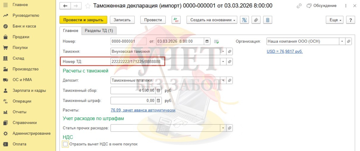 Далее на основании документа «Поступление товаров» была создана таможенная декларация по импорту. Заметим, что в этом документе в графе «Номер ТД» указывается номер таможенной декларации. В отличие от документа «Поступление товаров», где в графе «Таможенная декларация или РНПТ» указан номер РНПТ.