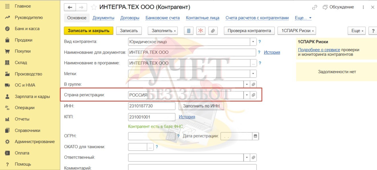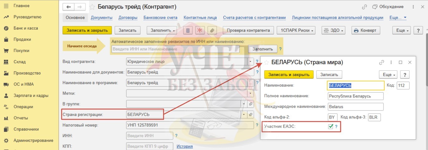 В нашем примере будет фигурировать контрагент, страна регистрации которого является Беларусь.