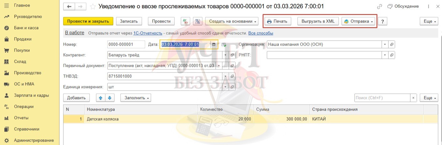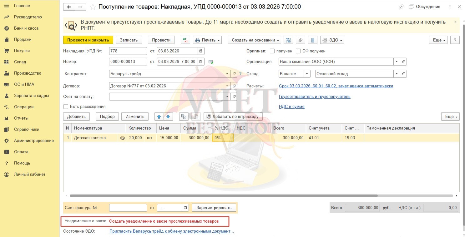 Далее высвечивается напоминание о том, что в документе присутствуют прослеживаемые товары, а это значит, что компании - импортеру необходимо создать и отправить Уведомление о ввозе в ИФНС в течение пяти рабочих дней с даты принятия товаров на учет.