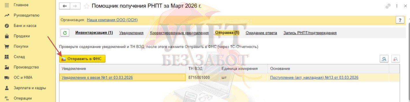 Если же в программе 1С: Бухгалтерия предприятия ред. 3.0 подключен сервис «1С-Отчетность», то требуется лишь нажать на кнопку «Отправить в ФНС» и уведомление будет отправлено.