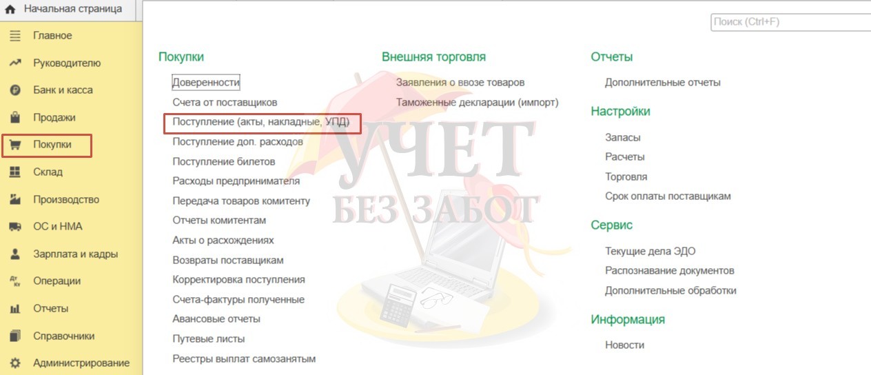 Для отражения поступления прослеживаемых товаров нам потребуется документ «Поступление (акты, накладные, УПД)» в разделе меню «Покупки».