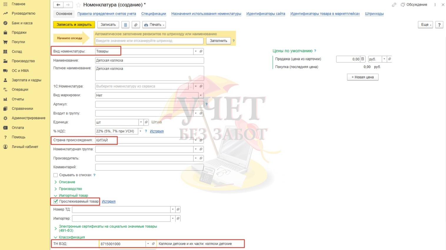 После того как в поле «Страна происхождения» мы выберем страну, в форме номенклатуры появится подраздел «Импортный товар». Здесь важно установить флаг «Прослеживаемый товар», а ниже, в подразделе «Классификация» выбрать соответствующий код в поле «ТН ВЭД».