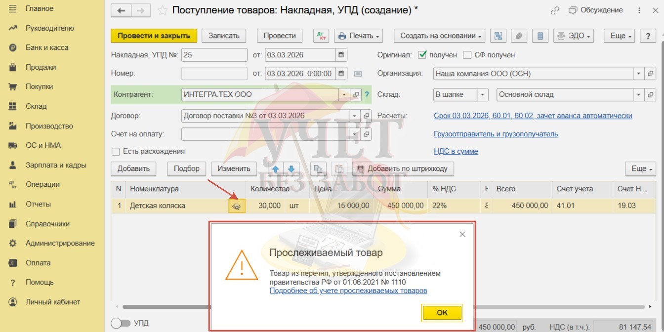 Поступление прослеживаемых товаров в 1С: Бухгалтерии предприятия ред. 3.0