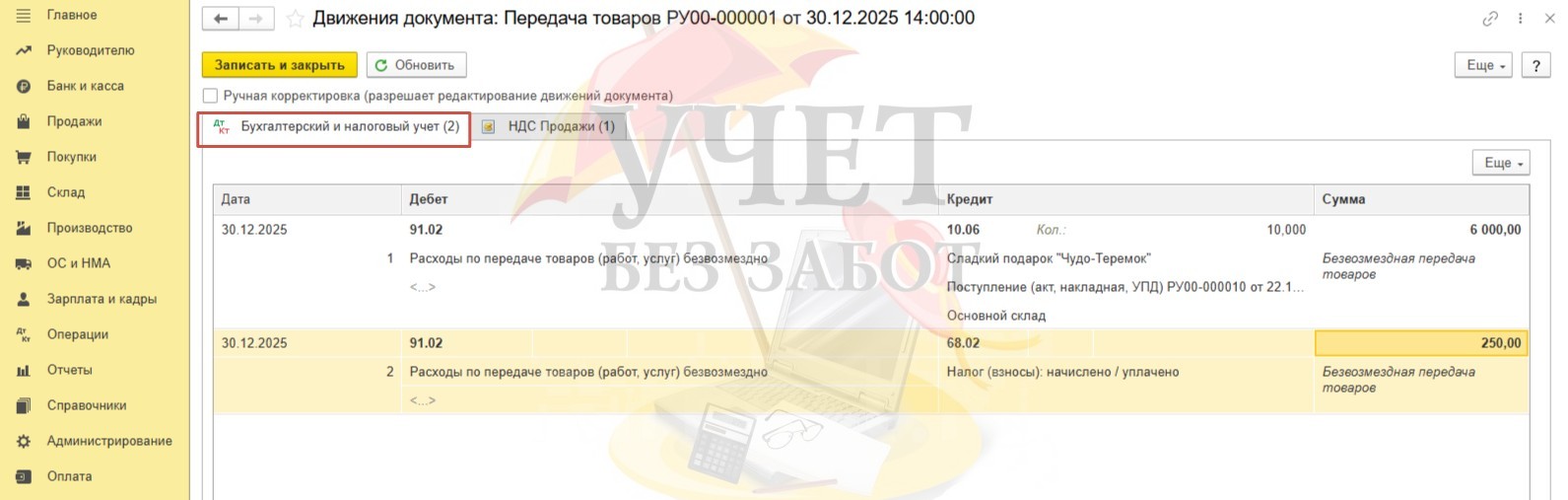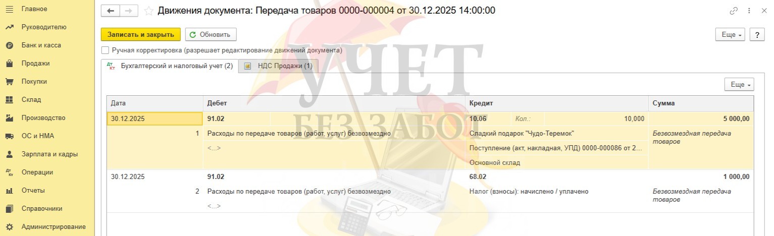 После проведения документа стоимость переданных подарков списывается в расходы только по бухгалтерскому учету на счет 91.02. Регистр «Книга учета доходов и расходов (раздел I)» не сформирован.