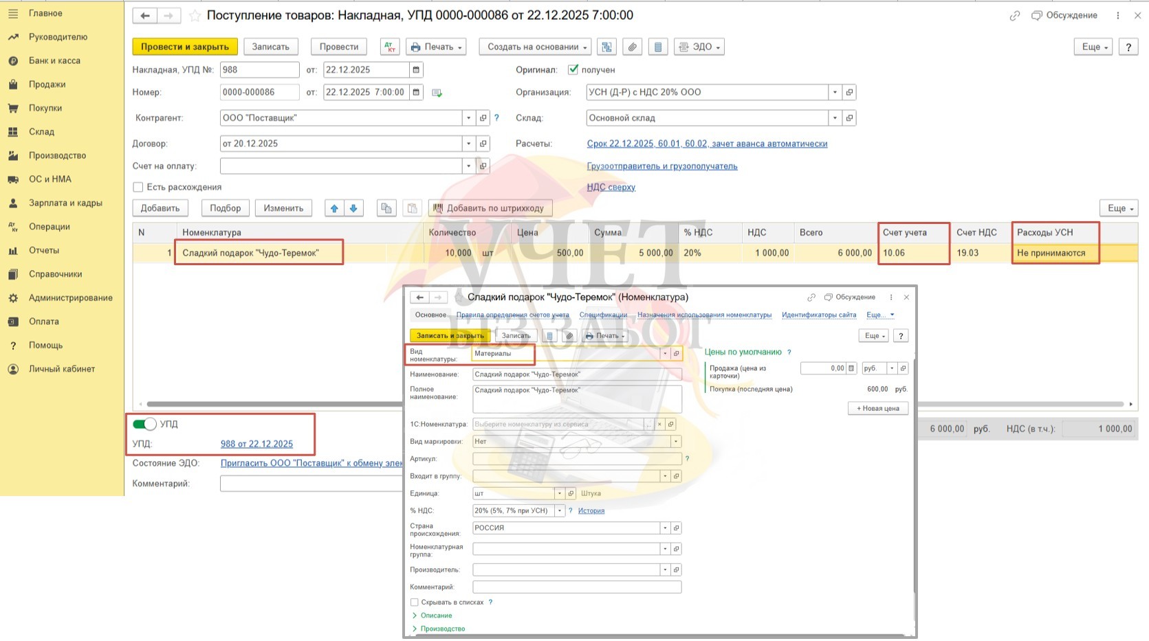 После заполнения обязательных реквизитов в шапке документа добавим в табличную часть номенклатуру с видом «Материалы». Перед тем как подарки будут списаны на счет 91.02, приобретенные ценности будут отражены по счету 10.06. Мы можем учитывать подарки таким образом, так как закупка и вручение подарков по условиям примера осуществляется в одном отчетном периоде. Поставщик предоставил счет-фактуру, и мы регистрируем её в программе, взведя переключатель «УПД». Организация, являющаяся плательщиком НДС по льготным ставкам, не имеет права на вычет по «входному» НДС. Убедитесь, что в документе установлен флаг «НДС включать в стоимость». А для того, чтобы стоимость подарков не попала в расходную часть при расчете налога, для колонки «Расходы УСН» установим значение «Не принимаются».