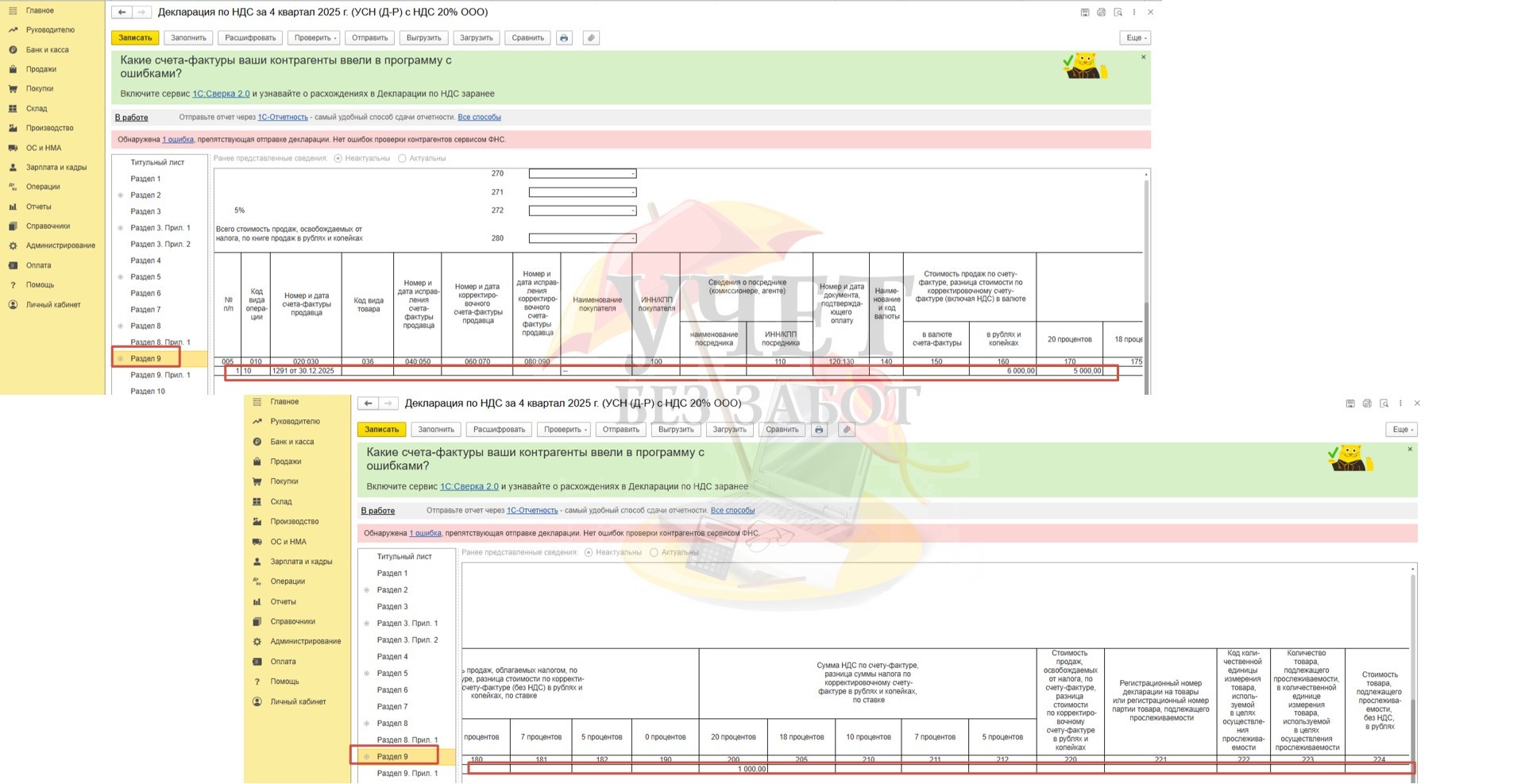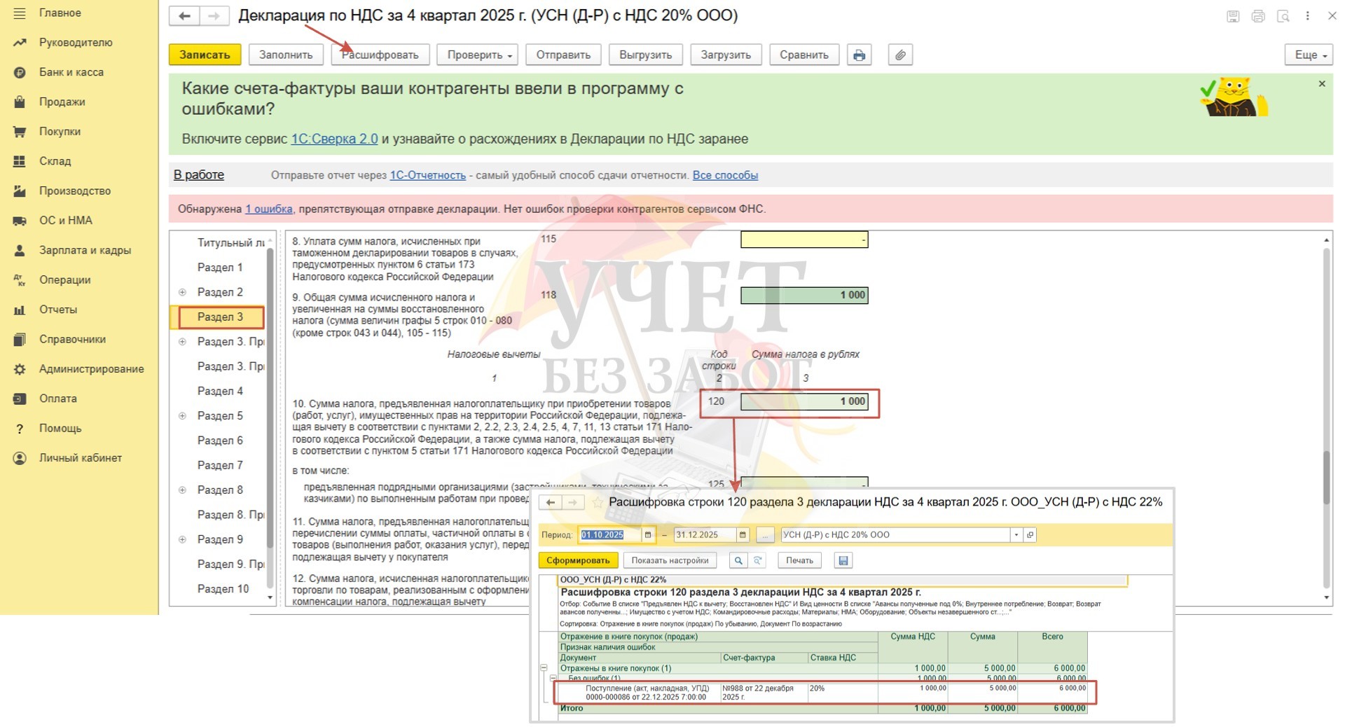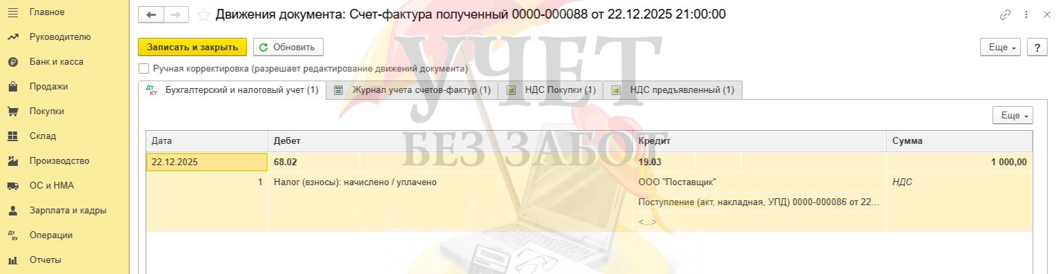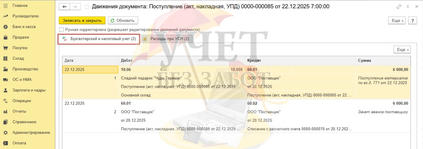 22.12.2025г – организация приобрела сладкие наборы в количестве 10 шт. на сумму 6 000 руб. (в т.ч. НДС – 1 000 руб.);