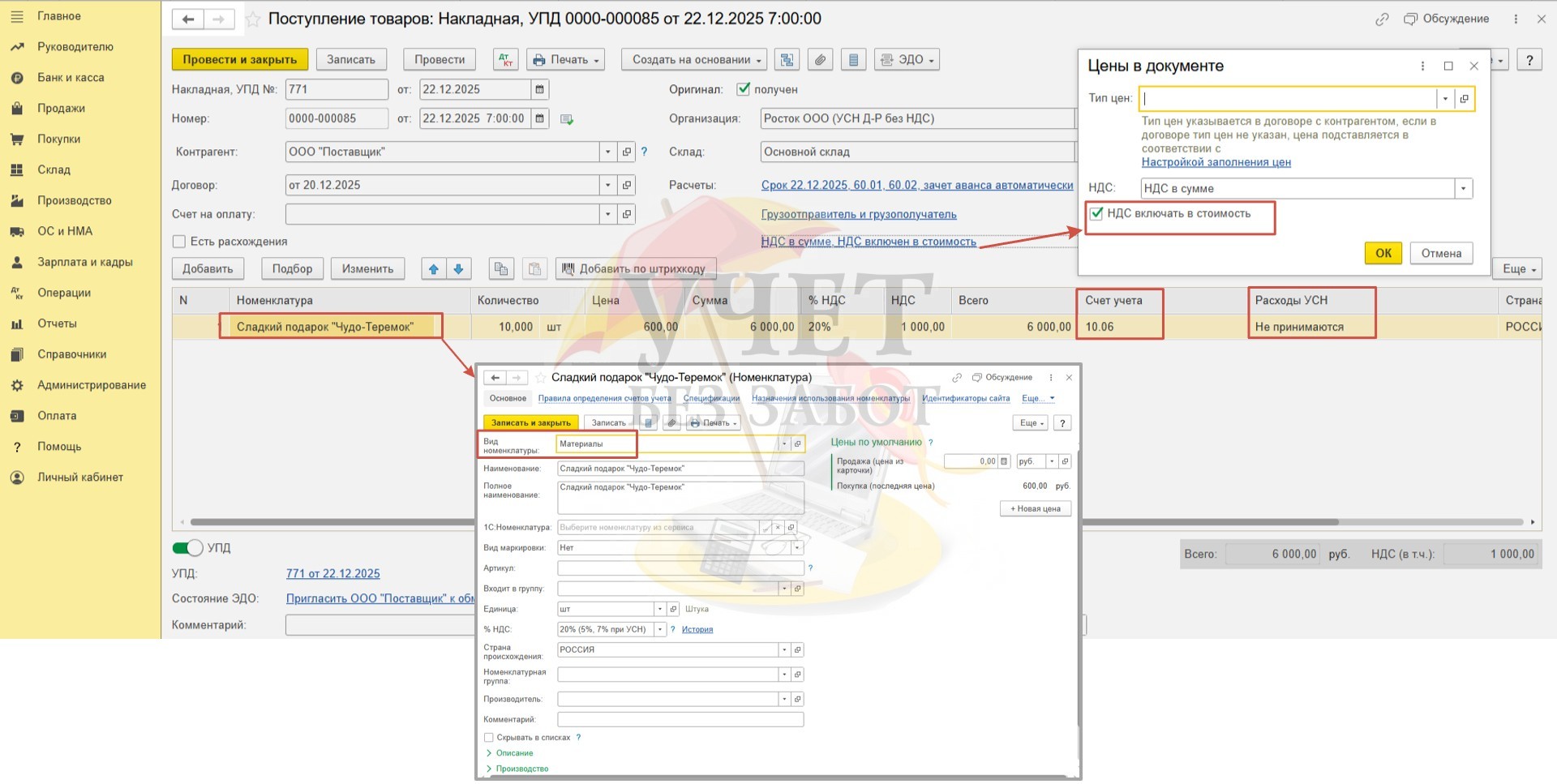На что обратить внимание при регистрации данного документа? Для учета приобретенных ценностей будем использовать счет 10.06, поскольку покупка и передача подарков по условиям нашего примера приходится на один отчетный период. Несмотря на то, что поставщик предоставил счет-фактуру, и мы зарегистрировали её в подвале документа, у организации, не являющейся плательщиком НДС, права на вычет по «входному» НДС нет. Поэтому необходимо убедиться, что в настройках по НДС установлен флаг «НДС включать в стоимость».