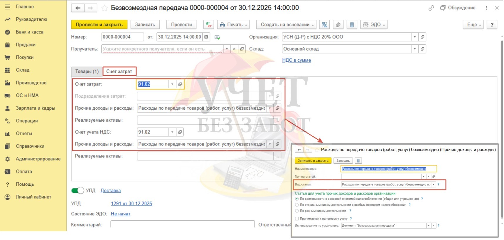 На вкладке «Счет затрат» по умолчанию устанавливается счет 91.02. Расход имеет вид статьи «Расходы по передаче товаров (работ, услуг) безвозмездно и для собственных нужд».