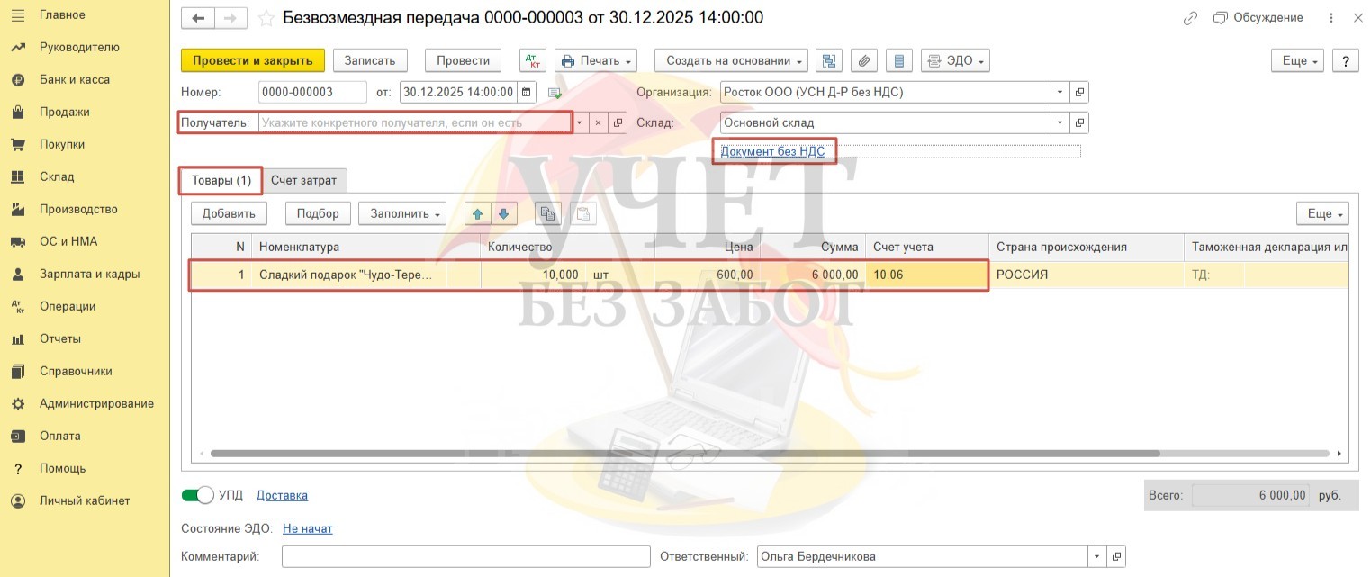 Перейдем в раздел меню «Продажи» и выберем пункт «Безвозмездная передача». Создадим новый документ. Укажем дату документа, которая соответствует моменту вручения подарков. В нашем случае получателей подарков несколько, поэтому поле «Получатель» не заполняем. На вкладке «Товары» добавим номенклатурную позицию, укажем количество и стоимость передаваемых подарков. По умолчанию установлена корректная настройка «Документ без НДС».