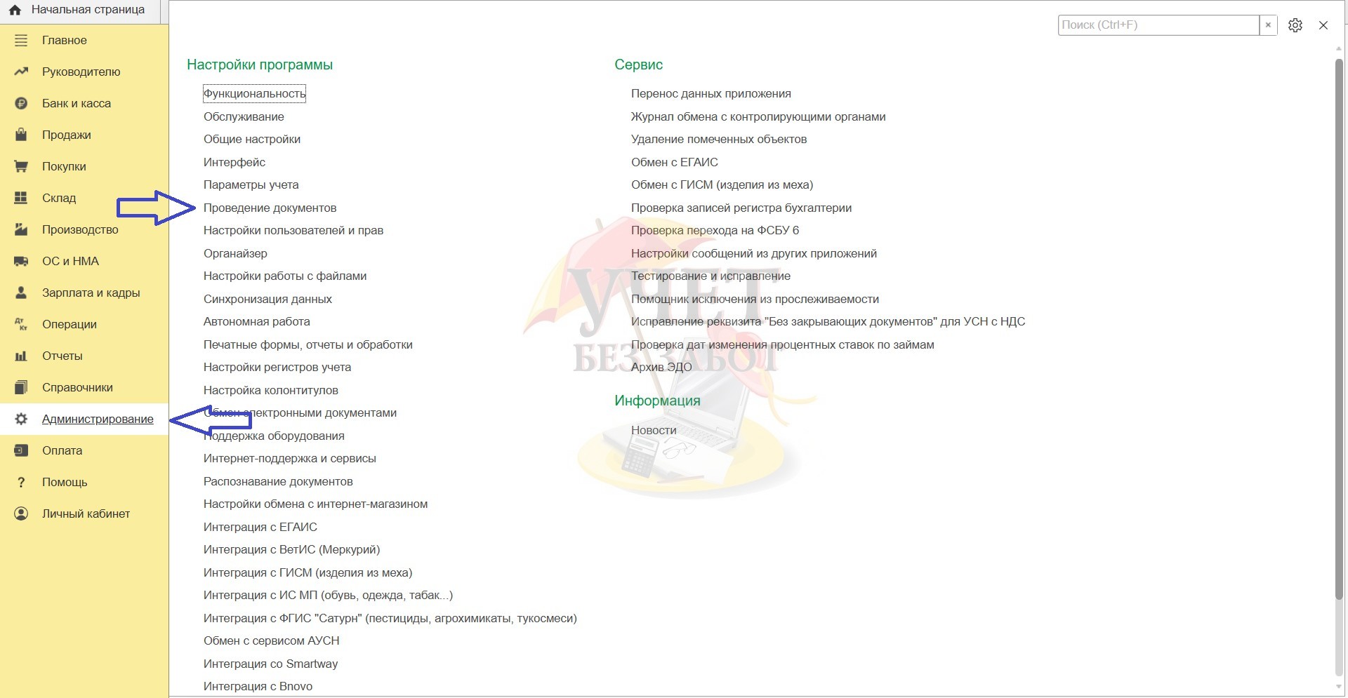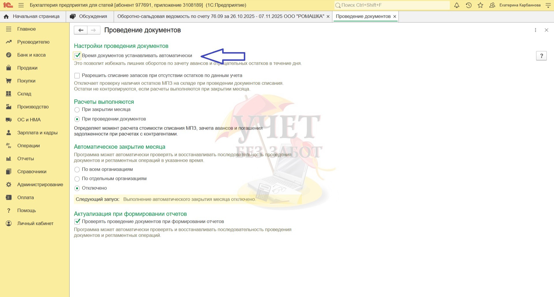 Чтобы настроить автоматическую установку времени в документах, нужно перейти в раздел меню «Администрирование» и выбрать пункт «Проведение документов», в котором далее необходимо установить галочку «Время документов устанавливать автоматически»: