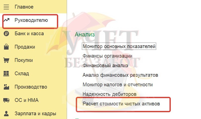 Поэтому информацию о чистых активах теперь стоит привести в пояснениях. Рассчитать их в программе 1С: Бухгалтерия предприятия ред. 3.0 можно автоматически в разделе меню «Руководителю» - «Анализ» - «Расчет стоимости чистых активов»: