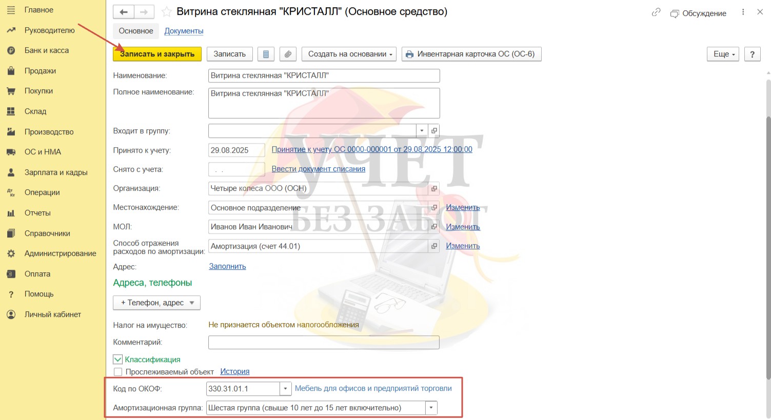 После того как мы выбрали код, поле «Амортизационная группа» будет заполнено автоматически. Запишем элемент.